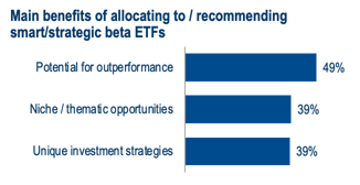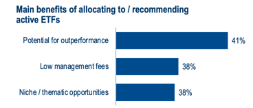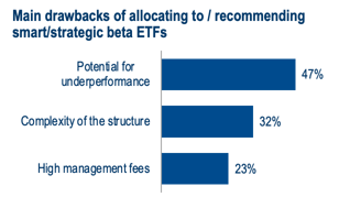 The biggest pro, voted for by 41%, for active ETFs is the potential for outperformance compared to passive. Potential for outperformance was also ranked top for smart/strategic beta ETFs.