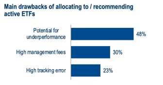 For active ETFs it’s the potential for underperformance that investors think is the biggest drawback, with 48% mentioning this. A separate question on expected tracking errors highlighted disparate views among intermediaries of how much tracking error, or active risk, they would tolerate in an active ETF. High tracking error was voted the third main drawback of active ETFs by 23%.