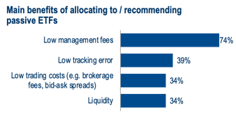 After fees, the biggest pro for allocating or recommending passive ETFs is low tracking errors, mentioned by 39% of survey respondents. Low trading costs and liquidity were also mentioned by 34% of respondents.