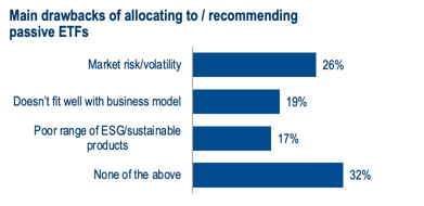 The cons for passive ETFs were led by market risk and volatility. This potentially reflects concerns of concentrated weightings to large-cap tech stocks in products tracking popular global and US indices. It also explains why the second response in the findings was that they don’t fit well with business models, and are considered less agile than active ETFs. Furthermore, they could also be more difficult to integrate into distribution models that are currently more reliant on commission payments.