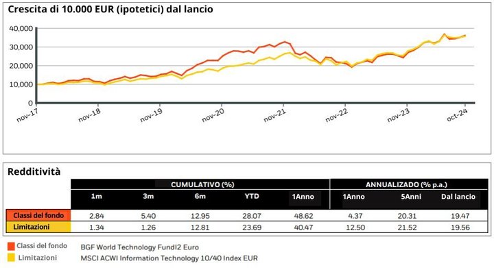 The data shown refers to past performance. Past performance is not a reliable indicator of future results and should not be the only factor considered in the selection of a product or strategy. The class of shares and benchmark returns are expressed in EUR, while the benchmark return of the hedge fund is expressed in USD. The returns shown are based on the net asset value (Net Asset Value, NAV), with reinvestment of gross proceeds, where applicable. If the investment was made in a currency other than that used for the last calculation of the return, the return on your investment may be higher or lower depending on currency fluctuations. Source: Factsheet BGF World Technology Fund I2 EUR to October 2024
