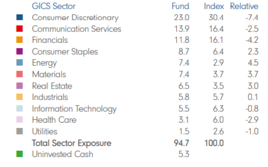 Sector or geographic allocations are what usually reveal the active nature of the funds or their tilt to a certain investment style. In this case, you can see that the fund tends to underweight those sectors more related to the growth style (Inf. Tech, Cons. Discretionary) and overweight those of a more value style (Energy, Material). Financials stands out, but they must be more related to the specific companies rather than the sector itself.