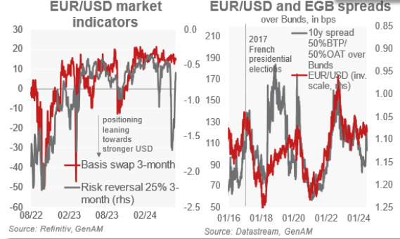 The EUR’s neglect of tighter EGB risk premia early in the year may have helped to cushion the adverse impact of new euro area worries into the elections (right chart). But we suspect that markets also underestimate the headwinds from French stalemate for fiscal policy and much needed reforms at the European level. The EUR/USD has also taken the risen odds of a (dollar bullish) Trump victory after Biden’s TV debacle in a stride. Overall, we sense some market complacency regarding policy risks, raising the odds of a renewed setback of the EUR.
