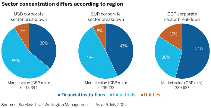 It is also worth noting that certain subsets of the fixed income universe can become very concentrated if implemented in EUR alone, meaning that diversification becomes even more important to help increase the potential for alpha and reduce concentration risk. Figure 1 shows the merits of global diversification in credit given the varied sector composition of the USD, EUR and GBP corporate credit markets. As well as giving investors access to a much bigger pool of capital, a global approach also reduces the risk of being overly concentrated in one sector. Notably, financials represent a much bigger share of the GBP and EUR markets. An active investor can take this diversification a level further down to individual issuer exposures.