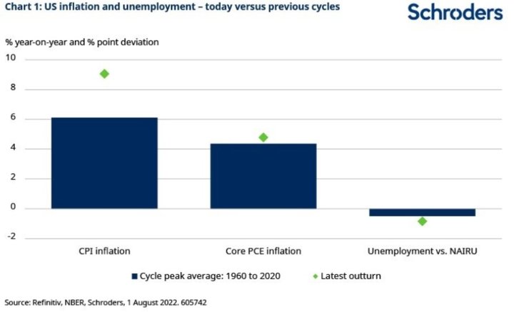 Meanwhile, CPI inflation has risen to 9.1%, its highest level for 40 years. Relative to previous peaks since 1960, the current position compares with an average CPI inflation rate of 6.1% and an unemployment rate 0.5% below the NAIRU (chart 1).