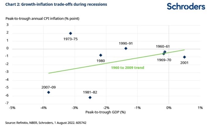 There was a wide range of experience, with inflation falling by more than average during the “Great Recession” of 2007-09 and the second “Volcker” recession of 1981-82, when GDP fell 3.8% and 2.5% and inflation by 5.5 and 6.2 pp respectively. The worst outcome in terms of the growth-inflation trade-off was 1973-75 when, despite a contraction of 3.1% in GDP, inflation actually rose 2%, a severe case of stagflation (see chart 2).