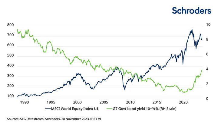 Chart 2: Global equities and G7 sovereign bond yields since 1988