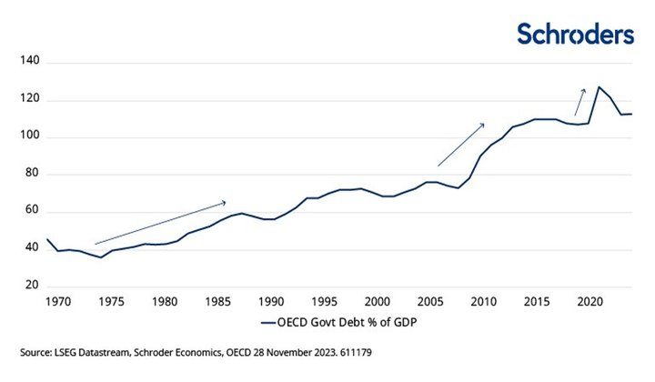 We expect inflation to improve and for interest rates to decline in 2024 in the US, eurozone, UK and across the OECD (with the exception of Japan). However, government debt will remain in the spotlight as (a) the decline in interest rates will not take rates back to pre-pandemic levels with equilibrium in the US and UK thought to be around 3.5% for example, and (b) funding budget deficits will require a significant increase in purchases by the private sector and quasi-public institutions such as Sovereign Wealth Funds.