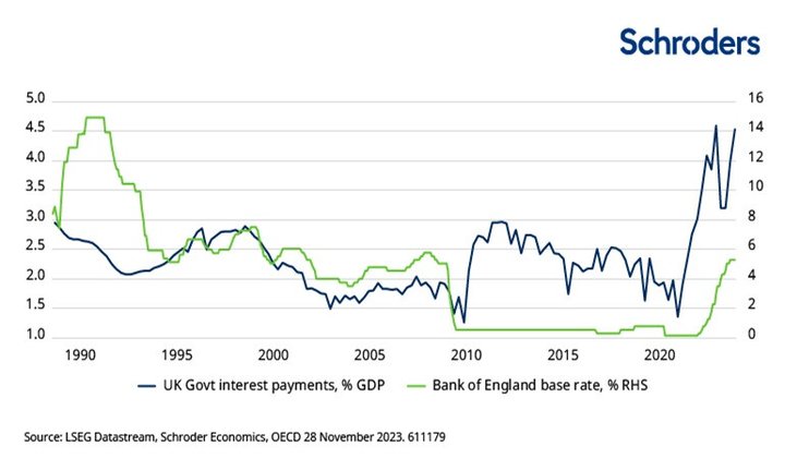 However, that changed as interest rates rose and the true cost of the increase in government debt was felt. For the UK, the high proportion of inflation-linked bonds, over one-fifth of outstanding government debt, was also a factor in taking UK interest payments to 4.5% of GDP in Q4 2022, the highest since the end of World War II.