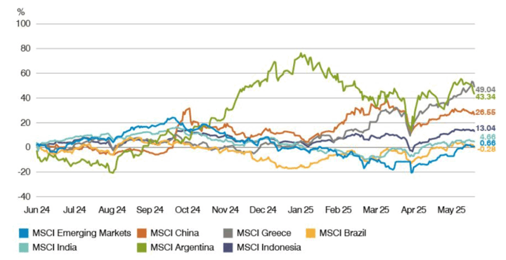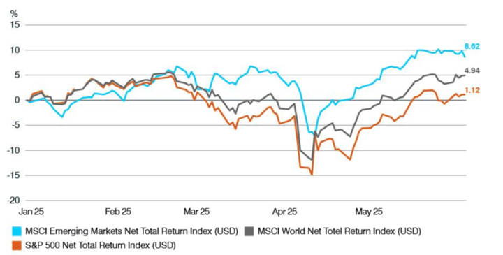 Emerging markets have performed well this year, outperforming global markets. The MSCI Emerging Markets (USD) index has returned 8.62% so far this year, outperforming both the MSCI World index, with 4.94%, and the S&P 500, with 1.12% (all in USD, as of May 30, 2025). This superior performance highlights the importance of selection and active management in seizing the right opportunities.