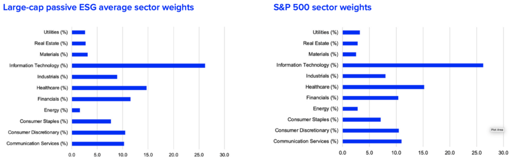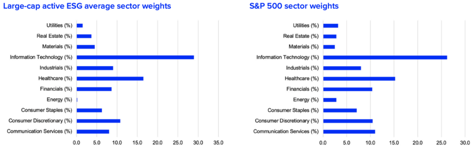 Unlike active funds, passive funds maintained an exposure to the energy sector. In many instances, it’s a very similar level of exposure that one would also find in the S&P 500. In fact, the differences in sector weightings across the board are remarkably unremarkable, nearly mirroring the S&P 500, says Jenkins. Passive and index products are often built with an eye toward delivering a market-like return under the ESG label, so Jenkins says the close mirroring of the market in terms of sector weightings shouldn’t surprise.
