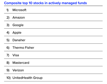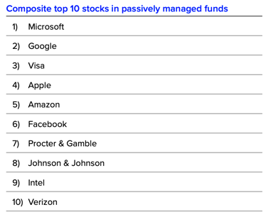 Unlike active funds, passive funds maintained an exposure to the energy sector. In many instances, it’s a very similar level of exposure that we would also find in the S&P 500. Collectively, these funds represent just shy of $30 billion in AUM across passive funds and ETF products. Because many of these funds have a cap-weighted index orientation, the top holdings tend to cascade in line with their cap sizes so the composite weight of the top 10 was 27% as compared to 40% for active. While Jenkins said we might expect there to be at least some differences in what active and passive managers hold at the top of their lists, the following table shows there isn't.