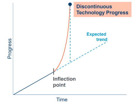 We believe Generative AI is a textbook example of discontinuous technological progress. These are extremely rare moments characterised by radical innovation that fundamentally change how industries operate, also leading to the creation of entirely new (current invisible, hard to imagine) market opportunities. These are typically underappreciated and unpredictable because decades of progress are packed into short time periods, but once proven, rapid adoption follows.