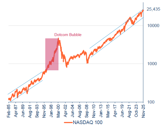 It is also important to remember that volatility is a normal feature of new technology cycles. Between 1995-1998 – the early years of the internet infrastructure build-out but before the dotcom bubble – the NASDAQ gained 354%. However, this strong period was punctuated by seven corrections of greater than 15% during the period. We believe the current backdrop remains highly reminiscent of the mid, rather than late 1990s.