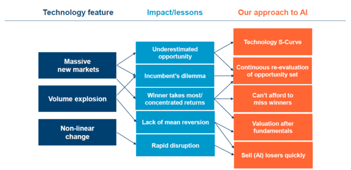 Given that we believe AI is poised to become the next General-Purpose Technology (GPT) – potentially disrupting all sectors and businesses – each theme and portfolio holding is now considered through an AI lens, to help identify potential winners (enablers and beneficiaries) and, equally importantly, avoid losers.
