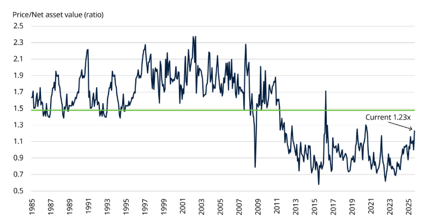 Chart 2: P/NAV valuations remain well below the long-term average.