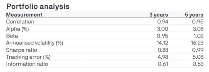 Aquí se puede reforzar lo que ya se vió en los resultados de rendimiento. Buenos resultados de alpha a 3 y 5 años, por lo que el equipo de inversiones ha podido lograr mejores resultados con un nivel de riesgo parecido o incluso menor al del mercado.