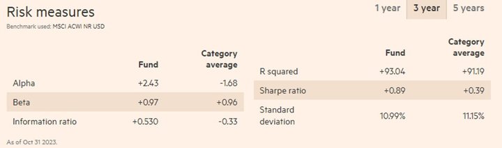 Al revisar los indicadores de riesgo que están en la tabla de arriba, lo primero que uno debe notar es que el Alpha a tres años es positivo (excess return), lo que significa que agrega valor sobre su índice de referencia (MSCI ACWI).