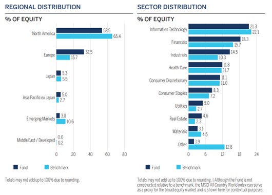 Una de las mejores muestras del manejo activo del fondo es la alocación regional y sectorial respecto de su índice de referencia. Aquí podemos ver marcadas diferencias en regiones como Estados Unidos y Europa (con diferencias de +10% en cada uno) y por el lado de Sectores, las diferencias no son tan grandes pero si, en su totalidad, cada porcentaje suma para que el fondo mire otros sectores que el índice pondera en menor manera.