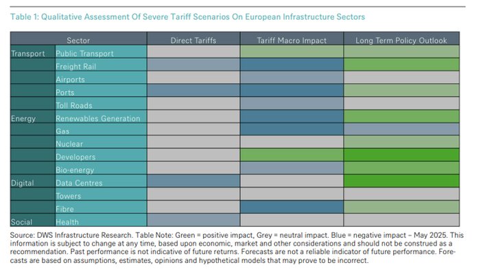 Con el objetivo de analizar de forma rigurosa un posible escenario adverso para el mercado europeo de infraestructuras, en caso de que se reintroduzca un régimen arancelario similar al denominado ‘Liberation Day’, DWS llevó a cabo un análisis sectorial en profundidad, cuyo resumen se recoge en la Tabla 1.