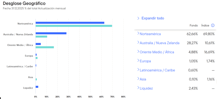 En cuanto a su asignación, se puede apreciar que a nivel de subsectores el fondo es bastante diverso en comparación con el índice de referencia. Es evidente la posición relevante en empresas que se dedican a la exploración y desarrollo en el sector del oro, apremiando el potencial de este tipo de empresas y sus resultados a largo plazo. En cuanto a la asignación geográfica, como se podría esperar, Franklin Gold & Precious Metals tiene la mayoría de sus posiciones en los mercados desarrollados, sobreponderando Estados Unidos frente a Australia.