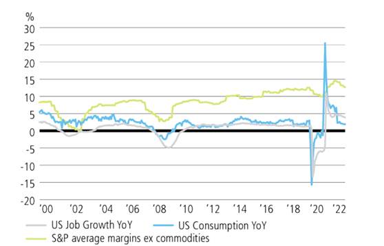 Los márgenes del S&P 500 tienden a correlacionarse positivamente con el crecimiento del empleo y del gasto