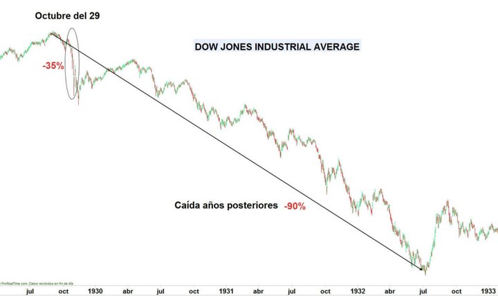 Por Fabián Tiscornia, periodista Para que se dé un hecho histórico se requiere que varios factores actúen en simultáneo y eso es lo que sucedió el 29 de octubre de 1929, el martes negro de la Bolsa de Nueva York, cuando los precios de las acciones se desplomaron entre 30% y 40%. Ese día se vendieron 16 millones de títulos bursátiles, una cifra récord que recién fue superada 40 años después. Este crac del 29 llevó a una crisis económica con efectos a nivel mundial. ¿Qué pasó para llegar a esa situación? El mundo post Primera Guerra Mundial tiene algunas claves. Estados Unidos vivió un auge económico, producto de su entrada tardía en la guerra y sus mejores condiciones financieras de salida respecto a Europa. A esto se sumaron mejoras de la productividad y un gran desarrollo de la industria automotriz y la de electrodomésticos, mientras las economías grandes europeas enfrentaban la crisis post guerra. Por ese entonces, la oferta superaba la capacidad de consumo, y la Reserva Federal (Fed) realizó una política monetaria expansiva que generó créditos a bajo costo. La sensación de dinero disponible “barato” para gastar por parte los consumidores hizo el resto del trabajo para impulsar la economía. A esta etapa de la economía estadounidense se la conoce como los felices años veinte. Este contexto se reflejó en los valores bursátiles de las empresas que comenzaron a subir de precio, en un primer momento acompañando los fundamentos de la economía. Esto llevó a que cada vez más estadounidenses se vieran “tentados” a participar de la fiesta de ganar dinero invirtiendo sus ahorros y el mercado de Wall Street crecía año tras año. Algunas cifras, mencionadas por Barry Wigmore en su libro The Crash and its Aftermath: A History of Securities Markets in the United States (1986), son elocuentes. La cantidad de corredores en la bolsa pasó de 706 en 1925 a 1.658 en 1929. Mientras un asiento en la bolsa costaba US$ 99.000 en 1925, tres años más tarde ya había subido a US$ 290.000 y para 1929 alcanzaba a US$ 652.000. Los fondos de inversión pasaron de 40 en 1921 a 750 en 1929, previo al crac del 29. Esta avidez por invertir, llevó a que los precios de las acciones empezaran a dejar de reflejar el valor real de las compañías y comenzara a gestarse una “burbuja”. El crecimiento constante en el valor de las acciones lleva a los inversionistas (entre los que había muy pequeños ahorristas) a especular que iban a seguir subiendo y por ende a comprar títulos con su consiguiente aumento de precio. No importaba llegar “tarde”, porque la expectativa era que, aún pagando un precio alto para comprar la acción, el mercado lo recompensaría con sucesivas subas en los días siguientes. La euforia en un mercado por entonces escasamente regulado, llevó al público a endeudarse para comprar acciones (“compras con margen”). Wigmore recuerda que los préstamos a corto plazo que daban los corredores para comprar acciones pasaron de US$ 4.400 millones en enero de 1928 a US$ 8.500 millones en octubre de 1929. El 3 de setiembre de 1929, el Dow Jones alcanzó su máximo (hasta ese entonces) de 381,17 puntos. Desde allí empezó a bajar. La economía estadounidense comenzó a dar señales negativas: las industrias del acero y la construcción comenzaron a caer, así como el precio internacional de las materias primas. La perspectiva de que el auge económico ya no sería el que era, llevó a los inversionistas a empezar a vender sus acciones. Primero lo hicieron los más avezados. El precio de los títulos bursátiles comenzó una tendencia bajista y cundió el nerviosismo en Wall Street. El jueves 24 de octubre, conocido como el jueves negro ya el Dow Jones caía 9% y no se encontraban compradores para algunos títulos. Los principales banqueros (Thomas Lamont de JP Morgan, Albert Wiggin de Chase National Bank y Charles Mitchell de National City Bank of New York) se reunieron entonces y acordaron inyectar dinero en las empresas más sólidas y estables para llevar calma. Pero la debacle continuó el lunes 28 y llegó el “martes negro”. El 29 de octubre de 1929, los corredores recibieron órdenes de venta de títulos en forma masiva, al punto de negociarse 16,4 millones de títulos en el día (un récord que se superaría recién 40 años después). Las acciones de empresas industriales cayeron 30% en promedio y las de bancos y fondos de inversión 40%. El Dow Jones tuvo una pérdida de 12% ese día. En total, en dos días se esfumaron unos US$ 30.000 millones de capitalización bursátil, 10 veces el presupuesto federal y más dinero del que Estados Unidos destinó a su intervención en la Primera Guerra Mundial. Casi tres años después, el Dow Jones había perdido un 90% desde el pico de 381,17 puntos, y recién en 1954 pudo alcanzar ese máximo.