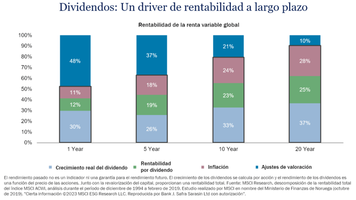 La desaceleración del crecimiento y unos tipos elevados hace que sea aún más importante contar con una estrategia de inversión resiliente que sea capaz de soportar las recesiones del mercado y brindar un atractivo potencial alcista a largo plazo. De hecho, los dividendos han sido el principal impulsor de las rentabilidades de las acciones a largo plazo, por lo que creemos que las estrategias de dividendos tienen mucho sentido en este momento.