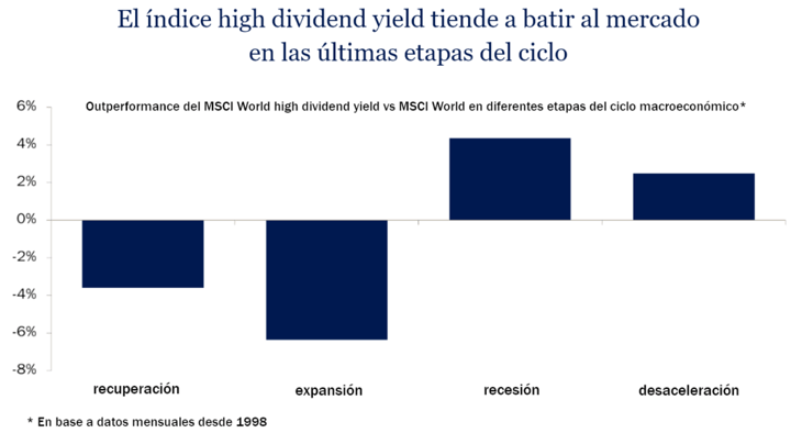 En este clima, las estrategias de dividendos deberían seguir beneficiándose de su carácter defensivo. Además, normalmente se han comportado bien durante las últimas etapas del ciclo, en el que aún nos encontramos.
