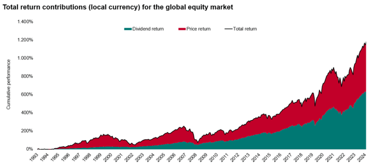 Los dividendos siguen siendo un componente fundamental de la rentabilidad bursátil a largo plazo. Desde 1993, el índice FTSE All-World ha subido casi un 1.150%, siendo 586 puntos porcentuales de ese incremento atribuibles a los dividendos reinvertidos. Una tendencia que probablemente cobrará mayor importancia, especialmente en un entorno de mercado con mayor incertidumbre y tendencias estanflacionistas.