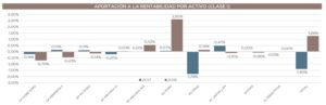 El nivel de diversificación acostumbra a ser clave en el comportamiento de los fondos de esta categoría. El siguiente gráfico del fondo Dunas Valor Flexible muestra cómo los distintos tipos y subtipos de activo han aportado a la rentabilidad global del fondo, lo que, implícitamente, atenúan su volatilidad: