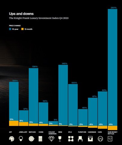 El panorama de inversiones está experimentando cambios significativos, especialmente en el ámbito de los activos tangibles de lujo, que representan una parte importante de las carteras de inversión de los ultrarricos (UHNWI). Durante 2023, vimos un aumento en los rendimientos del mercado financiero que influyeron en la distribución de estos activos, con algunos segmentos experimentando una caída significativa (whisky del -9%, autos clásicos -6% y bolsos -4%); mientras que otros mostraban un crecimiento considerable (arte un +11%, joyas +8% y relojes +5%).