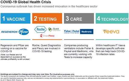 Algunos productos se han convertido en productos de alta necesidad como las vacunas que se están desarrollando en compañías como Regeneron, Pfizer o Gilead, las analíticas de los test analizadas por Roche, Quest Diagnostics y Fleury, los respiradores que hace Fisher & Paykel o Medtronic o las aplicaciones para seguir la evolución del virus de Veeva.