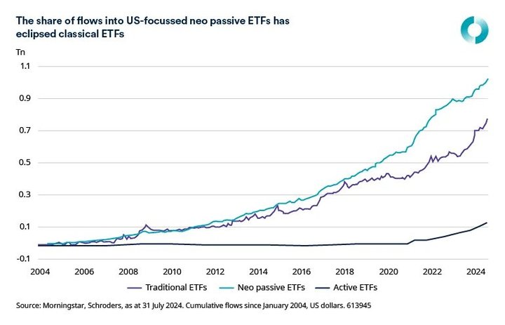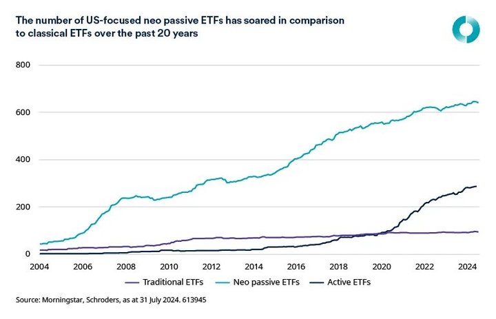 Podríamos haber señalado los argumentos anteriores en cualquier momento de la historia. Pero lo que ha cambiado recientemente es el aumento de inversores que entran en esta categoría de "inversores activos", pero que no son gestores activos de fondos de renta variable. Por eso creemos que podemos tener más confianza en las perspectivas de futuro de los gestores de fondos activos. En primer lugar, ha habido una proliferación de ETF en los últimos años que no siguen el mercado en general. A estos los llamamos "neo pasivos". Solo en los EE. UU., ahora hay más de seis veces más de este tipo de ETFs que los ETF tradicionales y las entradas en estas estrategias han sido un 50% más altas que los ETF tradicionales desde principios de 2018 hasta finales de julio de 2024.
