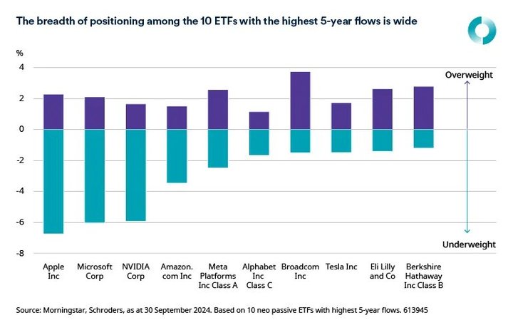 Puedes ver las consecuencias al observar cuánto asignan estos ETF a las acciones más grandes del mercado estadounidense. El siguiente gráfico muestra esto para los 10 ETF neopasivos de renta variable estadounidense que han atraído las mayores entradas en los cinco años hasta el 30 de septiembre de 2024. Estos 10 ETF representan aproximadamente la mitad del total de entradas a ETF neo pasivos durante este período.
