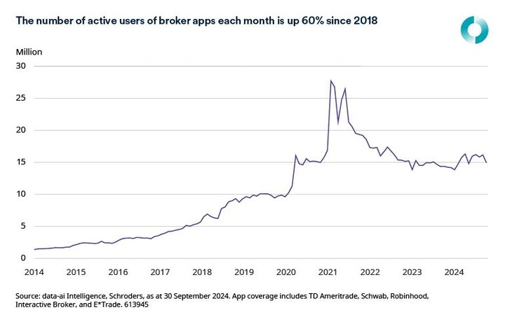 Si bien el número de usuarios activos mensuales de las principales aplicaciones de brokers ha caído desde su pico de Covid, se mantiene más del 60% por encima del nivel de 2018. A diferencia de muchas otras tendencias posteriores a la pandemia, el interés entre los estadounidenses por invertir ha perdurado.