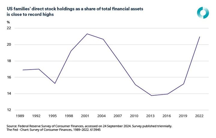 Por supuesto, muchas de estas personas pueden estar comprando ETF del S&P 500, pero la evidencia sugiere lo contrario. Los datos de la Encuesta de Finanzas del Consumidor de la Reserva Federal muestran que las tenencias directas de acciones como proporción de los activos financieros totales han aumentado cerca de niveles no vistos desde el pico de la burbuja de las puntocom. Esta cifra es solo acciones de propiedad directa y no incluye fondos mutuos o ETF.