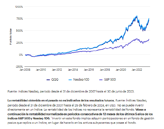 Información importante: Esta comunicación de marketing es sólo para fines de discusión y uso exclusivo de inversores profesionales en España. No está destinado para distribuirse al público. Los inversores deben leer la documentación legal antes de invertir. Datos a 19 de abril de 2024, salvo mención expresa. El presente es material de marketing y no asesoramiento financiero. No pretende ser una recomendación de compra o venta de ninguna clase de activos, valores o estrategias en particular. Por lo tanto, no son aplicables los requisitos normativos que exigen la imparcialidad de las recomendaciones de inversión/estrategia de inversión, ni las prohibiciones de negociar antes de su publicación. Los puntos de vista y opiniones se basan en las condiciones actuales del mercado y están sujetos a cambios. Para más información sobre nuestros fondos y los riesgos correspondientes, consulte los documentos de datos fundamentales (en los idiomas locales) y el folleto (en alemán, francés, inglés), así como los informes financieros, disponibles en invesco.eu. Un resumen de los derechos de los inversores está disponible en inglés en invescomanagementcompany.ie. La sociedad gestora puede rescindir los acuerdos de comercialización.Habitualmente, no se puede volver a vender directamente a los fondos cotizados UCITS las participaciones/acciones de ETF con estatus UCITS adquiridas en el mercado secundario. Los inversores deben comprar y vender participaciones/acciones en un mercado secundario con la asistencia de un intermediario (por ejemplo, una agencia o sociedad de valores) y, al hacerlo, podrían incurrir en gastos. Además, puede que los inversores paguen un importe superior al valor liquidativo vigente al comprar participaciones/acciones y reciban un importe inferior al valor liquidativo vigente al venderlas. Invesco EQQQ NASDAQ-100 UCITS ETF: NASDAQ® y NASDAQ-100 IndexSM son marcas comerciales de Nasdaq, Inc. (junto con sus filiales, las «corporaciones») e Invesco cuenta con licencia para su uso. El/Los producto(s) carecen de aprobación de las corporaciones en cuanto a su legalidad o su idoneidad. Las corporaciones no emiten, respaldan, comercializan o promueven el/los producto(s). LAS CORPORACIONES NO FORMULAN GARANTÍAS Y EXCLUYEN TODA RESPONSABILIDAD CON RESPECTO AL / A LOS PRODUCTO(S).Para consultar todos los objetivos y la política de inversión, consulte el folleto actual.Invesco Investment Management Limited, Ground Floor, 2 Cumberland Place, Fenian Street, Dublin 2, Ireland. Regulado por el Central Bank Ireland.EMEA3525896/2024