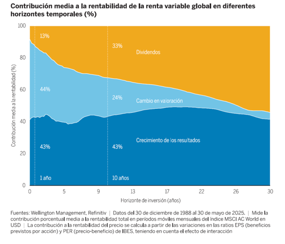Los ingresos constituyen un elemento fundamental de la rentabilidad de las acciones, sobre todo con horizontes temporales prolongados. Si bien en períodos de más de un año, los cambios en la valoración y el crecimiento de los resultados empresariales contribuyen a grandes rasgos en igual medida, a más largo plazo predominan los dividendos y el crecimiento de los resultados gracias al efecto de la capitalización compuesta. (Gráfico 1).