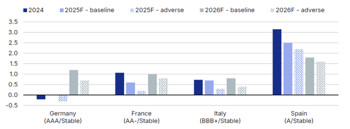 En este escenario, mantenemos nuestras perspectivas de base para el crecimiento del PIB de España en el 2,5% en 2025 (A/Estable) a pesar de la ralentización del crecimiento mundial y de la incertidumbre que rodea a las negociaciones comerciales y arancelarias con EE.UU. Las tranquilizadoras perspectivas a corto plazo se apoyan en un crecimiento mayor de lo esperado el año pasado (3,2%) y en el sólido impulso del primer trimestre.
