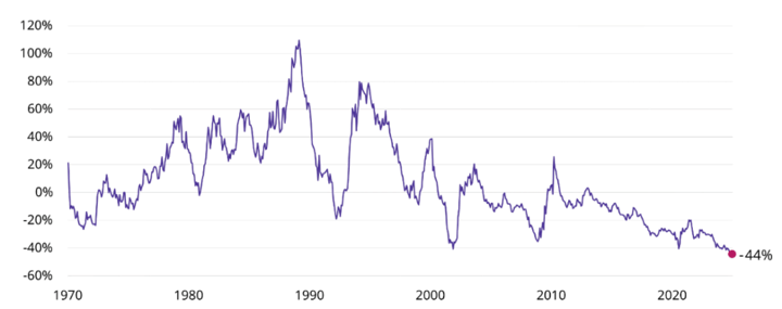 La renta variable global ha cotizado con descuento respecto a la estadounidense durante 15 años, pero, a finales de 2024, ese descuento alcanzó un nivel que no se había visto en 50 años. El MSCI World ex US Index cotizaba con un descuento del 44% con respecto a las acciones estadounidenses, medidas por el MSCI USA Index. Esta diferencia no se debe únicamente a las acciones tecnológicas estadounidenses. En casi todos los sectores, la renta variable internacional cotiza con descuento respecto a la estadounidense. Desde esta perspectiva sector por sector, el descuento medio es del 27%.