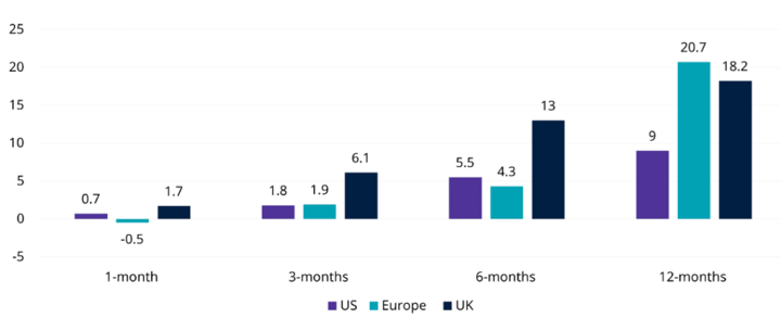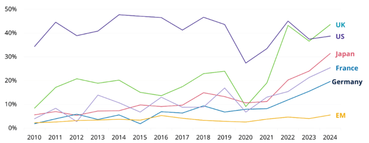 Las recompras de acciones han sido una medida especialmente popular en Estados Unidos, ya que esta devolución de capital a los accionistas puede mejorar los beneficios por acción de una empresa y elevar potencialmente el precio de las acciones. En los últimos cinco años, más empresas de otros países, como Japón, Francia y Alemania, han aplicado esta estrategia. En particular, en 2024, la proporción de empresas de Reino Unido que realizaron recompras superiores al 1% de sus acciones en circulación superó el nivel observado en las empresas estadounidenses (Ver el gráfico E). Esta tendencia subraya un cambio global hacia el aprovechamiento de las recompras como herramienta para aumentar el valor para el accionista.