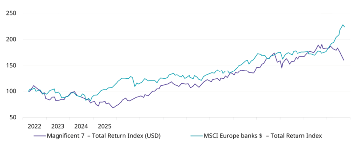 Gráfico F: Los bancos paneuropeos han superado a los Siete Magníficos en rentabilidad total durante gran parte de los últimos tres años