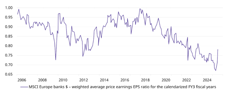 Los titulares de las noticias financieras en EE.UU. sugieren que los Siete Magníficos han sido los únicos ganadores durante los últimos años. Toda la atención que han recibido puede haber hecho que los inversores estadounidenses pasaran por alto un hecho sorprendente: los bancos paneuropeos superaron a los «Mag 7» en rentabilidad total durante la mayor parte de los últimos tres años. (Ver el gráfico F).