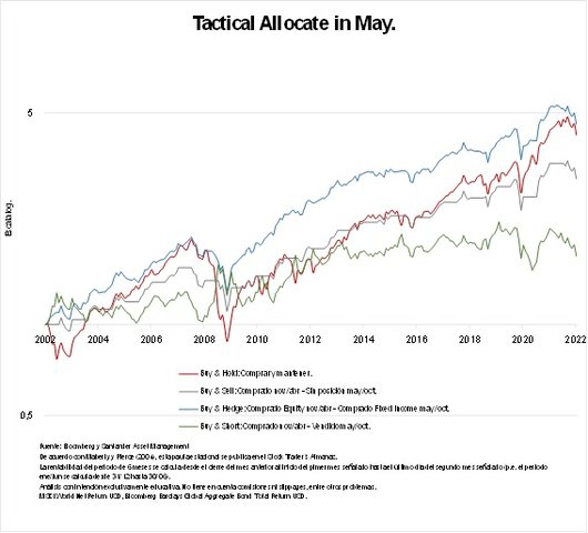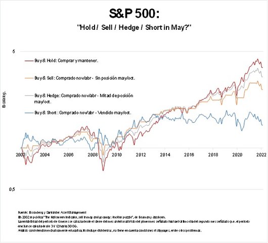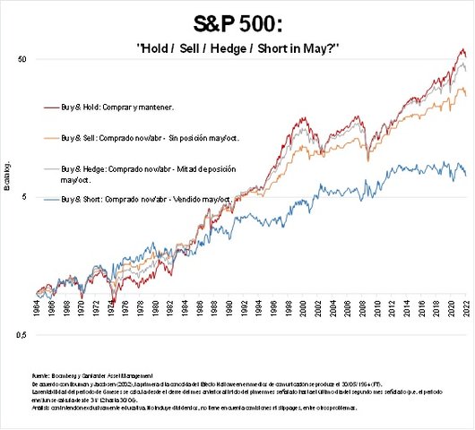 Por esto, en los próximos gráficos podemos ver cómo un sencillo “mantener” bate a estrategias que planteen vender o ponerse corto en mayo. Tan sólo estrategias que se basen en buscar coberturas parece que podrían competir con lo más simple.