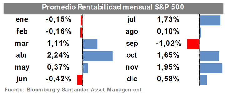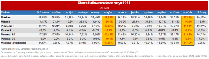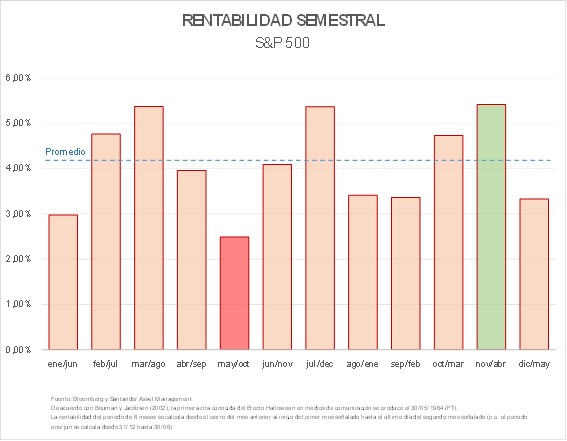 Es cierto que la última parte de un año y la primera del siguiente suelen ser periodos positivos en las bolsas. Al menos desde mayo de 1964, el S&P 500 ha cerrado entre el 31 de octubre y el 30 de abril en positivo tres de cada cuatro años, con un rendimiento superior al de cualquier otro periodo de seis meses. Por su parte, los seis meses siguientes (mayo/octubre) suelen ser los más débiles.