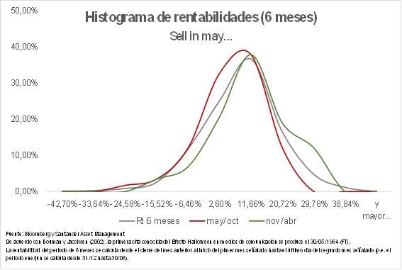 Sea como sea, es evidente que se observa cierta tendencia de las series del periodo entre mayo y octubre a tener rentabilidades inferiores al promedio (aunque no necesariamente negativas) y del periodo entre noviembre y abril a tener unas rentabilidades superiores al promedio.