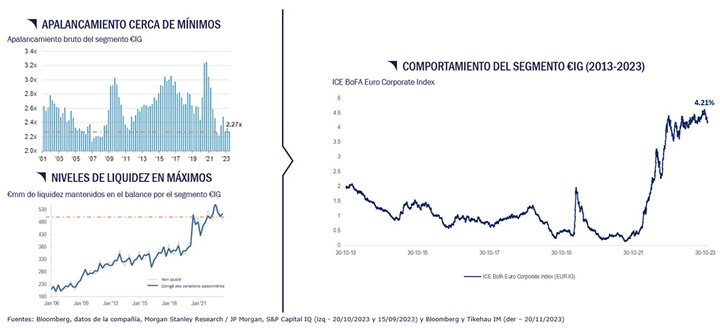 Tikehau 2029, que se encuentra registrado en España, ya ha constituido su cartera inicial. A cierre de noviembre (30/11/2023) su exposición a bonos corporativos investment grade era del 51%3 . El racional de esta posición de la cartera consiste en tratar de capturar la fuerte corrección del segmento durante los últimos trimestres; beneficiarse de un perfil de compañía que consideramos sólido de cara a un escenario macroeconómico deteriorado y eliminar el riesgo de refinanciación, dotando a la cartera de mayor visibilidad respecto al rendimiento a vencimiento.