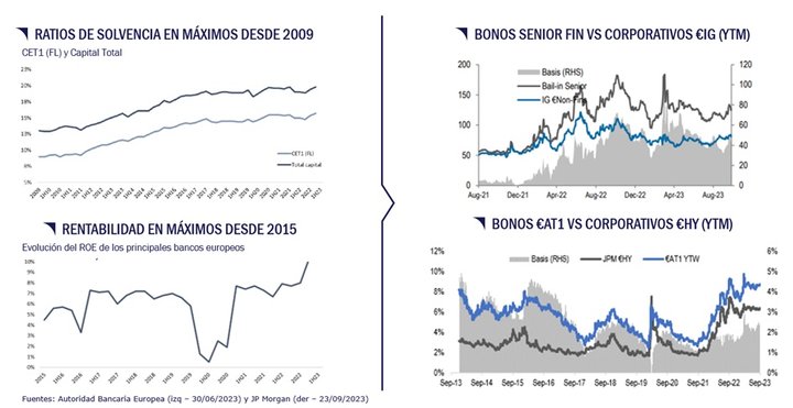 Por otro lado, complementan la cartera emisiones del segmento financiero tanto senior (20% a 30/11/2023) como subordinadas (26% a 30/11/2023)3. Bajo nuestro punto de vista, los fundamentales del sector siguen siendo sólidos como han mostrado los últimos resultados trimestrales y los tranquilizadores test de estrés llevados a cabo por la EBA en julio. Asimismo, en nuestra opinión las valoraciones del segmento resultan atractivas: de forma relativa los bonos financieros ofrecen mayor prima que los corporativos en los segmentos senior y subordinados y sus valoraciones en términos absolutos son históricamente elevadas, especialmente en el caso de los subordinados AT1.