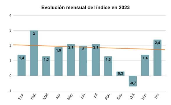 El índice, resultado de la media ponderada de respuestas a la pregunta sobre la evolución de los mercados bursátiles en los próximos 6 meses, continúa en niveles positivos (+1,05). Ello a pesar de los efectos del conflicto armado entre Israel y Hamás, que hundió la confianza en el mes de octubre, situándose temporalmente en negativo ( -0.7) por primera vez en el año. Pero, como se observa en el gráfico desglosado por meses, el rebote fue igualmente fuerte hasta alcanzar a cierre del año el 2,4. Un nivel de optimismo similar al experimentado a comienzos de 2003.